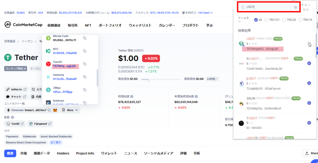 この時色々な通貨が出てきますが「TR7N…」と書いてあるのが正しいUSDTなので間違えないようにしましょう。