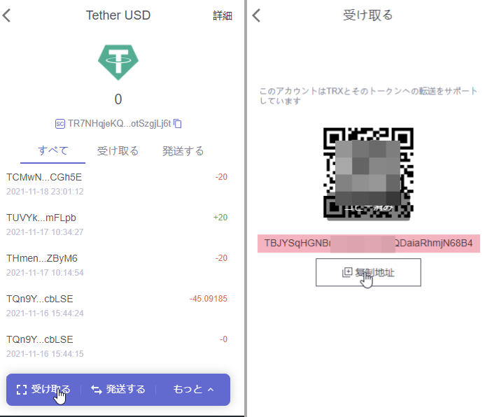無事にUSDTをアカウントに追加する事が出来たら、USDTをクリック→受け取る→…制地というのを押して、受け取る為のアドレスをコピーします。