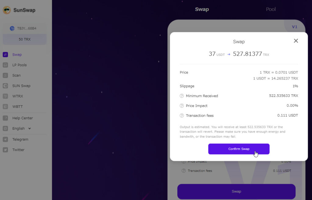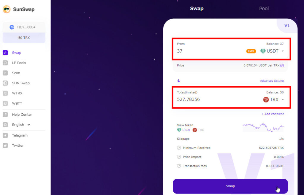 まずトロンに変えたい数量のUSDTを入力し、SWAPをクリック(今回は37)