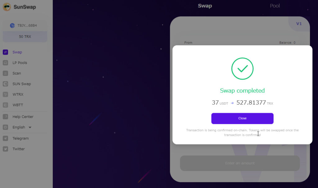 無事にSWAPが出来れば、「SwapCompleted」という画面が出てきて交換した分のトロンがアカウントに追加されます。