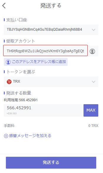 すると受け取りアカウントと数量を入力する欄が出てくるので、取引所のトロンアドレスを受け取りアカウントに貼り付けて、送りたい数量を指定します(今回は566.45トロン)