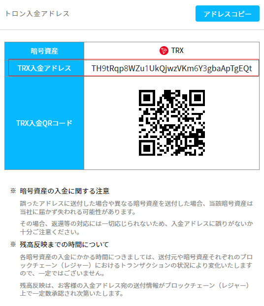 トロンリンクウォレットに送る際は