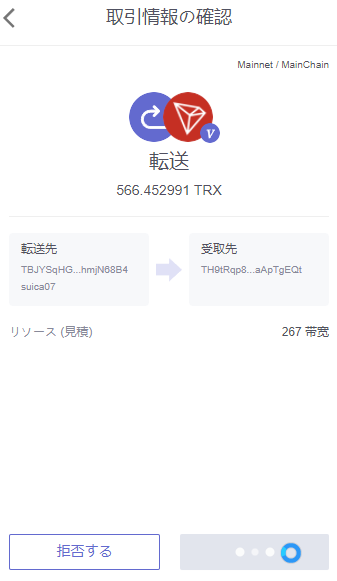 「発送する」を押したら確認画面が出てくるので、右側の転送をクリック。これで取引所にトロンを送る事が出来ます。
