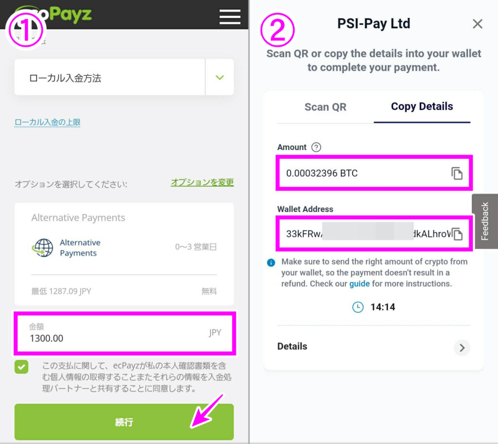 - エコペイズでローカル入金 → Alternative Paymentsへ進み、送金額を入力