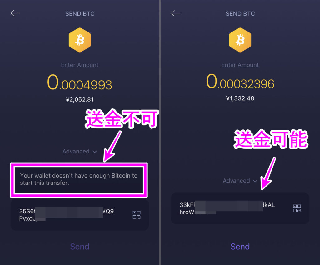 ちなみに以下左の画像はウォレットに金額が足りず送金不可の場合です。右側のようにエラーが出ていなければ送金可能。