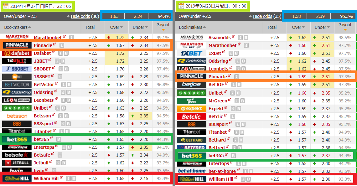 そこで「リバプールVSチェルシー」の2014年のオッズと今月のオッズ、「Over/Under +2.5」を見比べてみました。