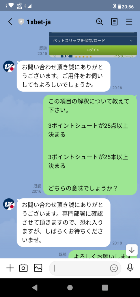 ベットについてサポートに問い合わせをおこない、ベット項目が「両チーム3ptシュートが25点以上決まる」という内容であることを確認しました。