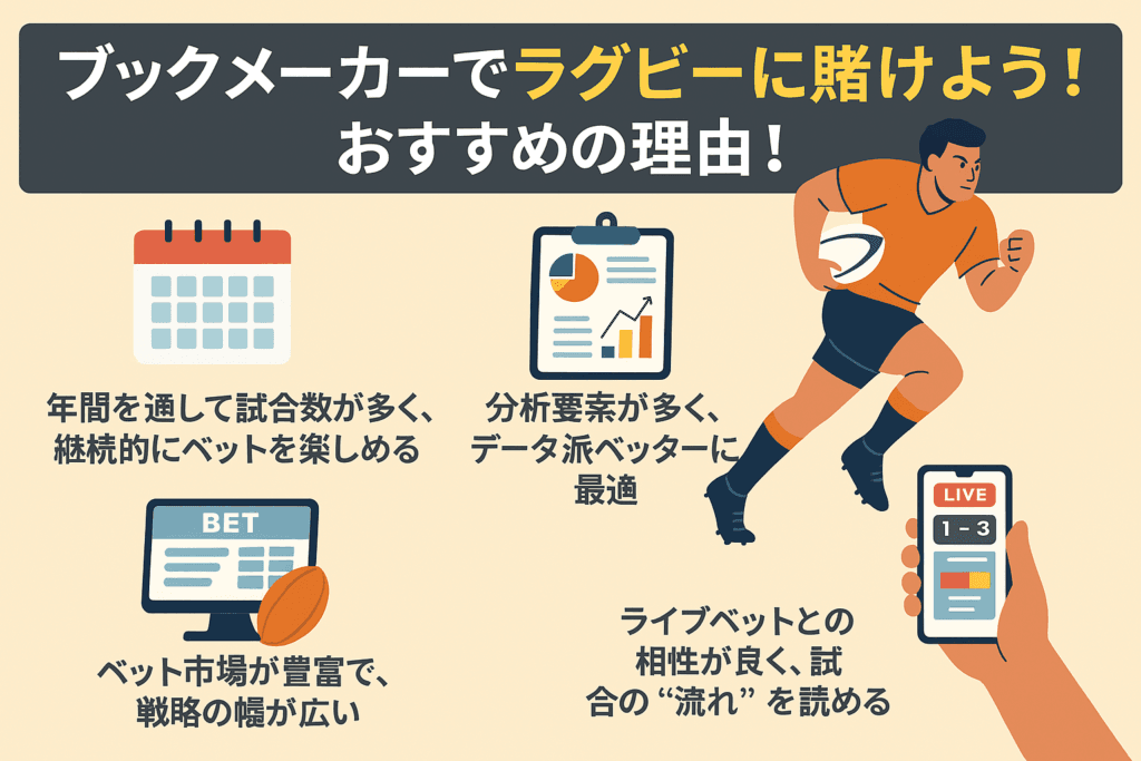 ラグビーは戦術・データ・フィジカルのすべてが噛み合う、戦略的スポーツベッティングに最適な競技です。世界中で年間を通じて試合が行われ、主要リーグから国際大会まで幅広いマーケットが展開されています。ここでは、ブックメーカーでラグビーが特におすすめと言える理由を4つの観点から解説します。