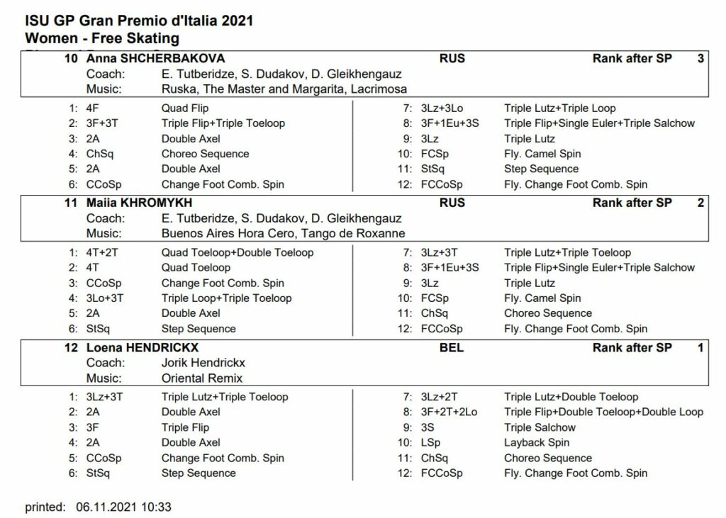 女子ショートプログラム3位のシェルバコワ選手、2位のフロミフ選手、1位のヘンドリックス選手のフリースケーティングにおける「予定構成」です。