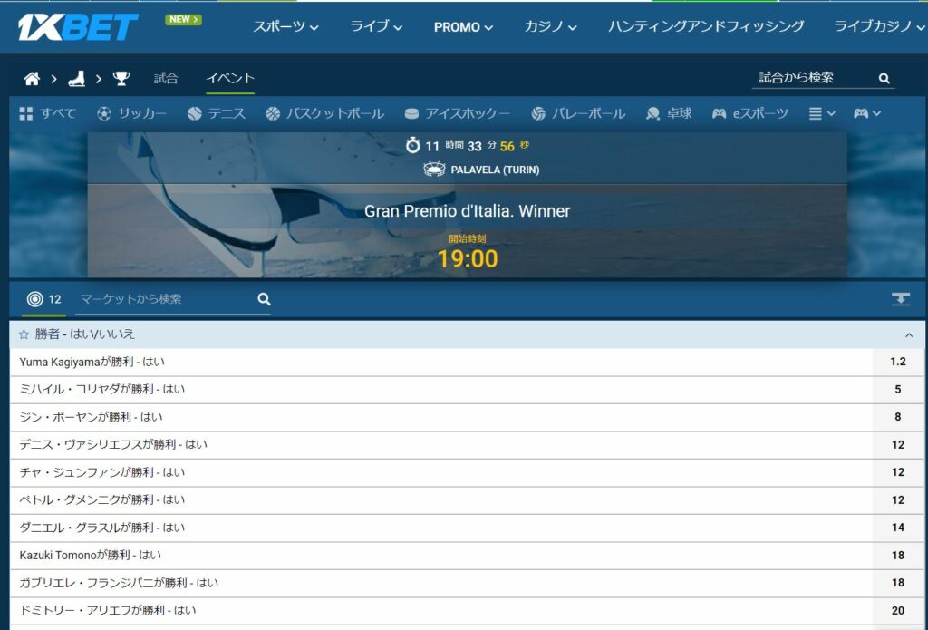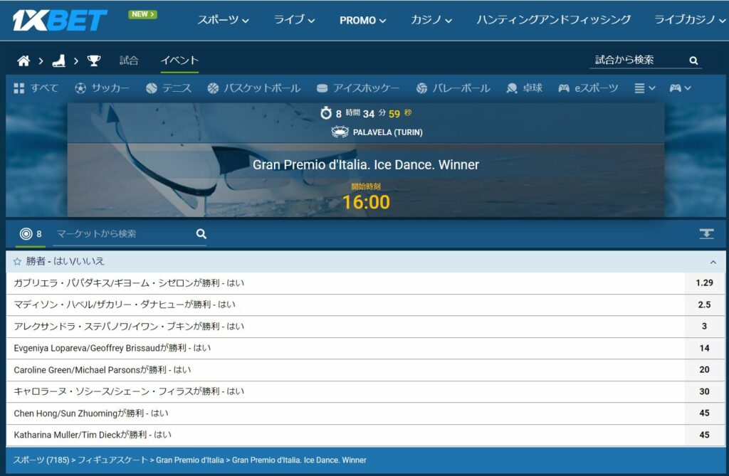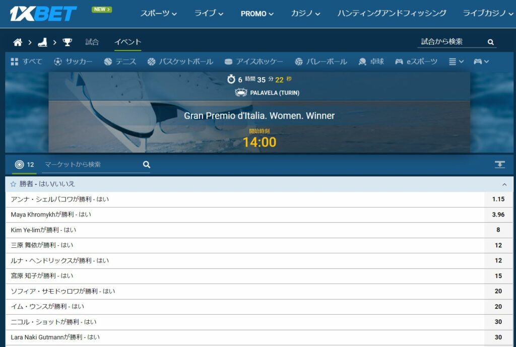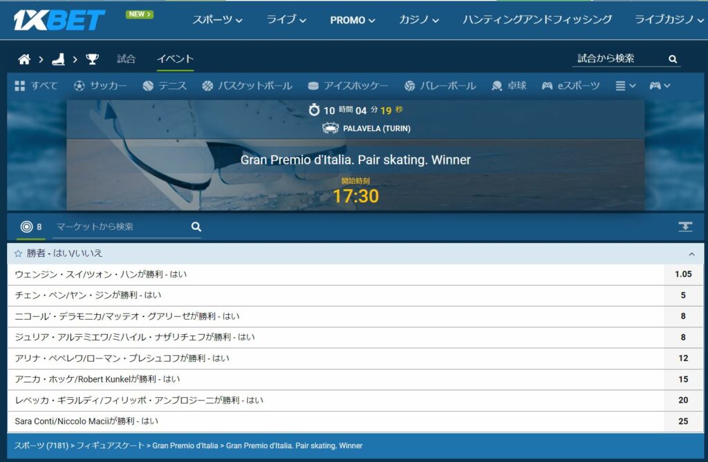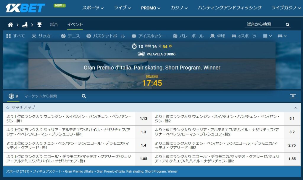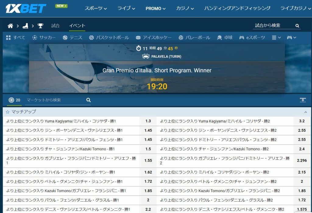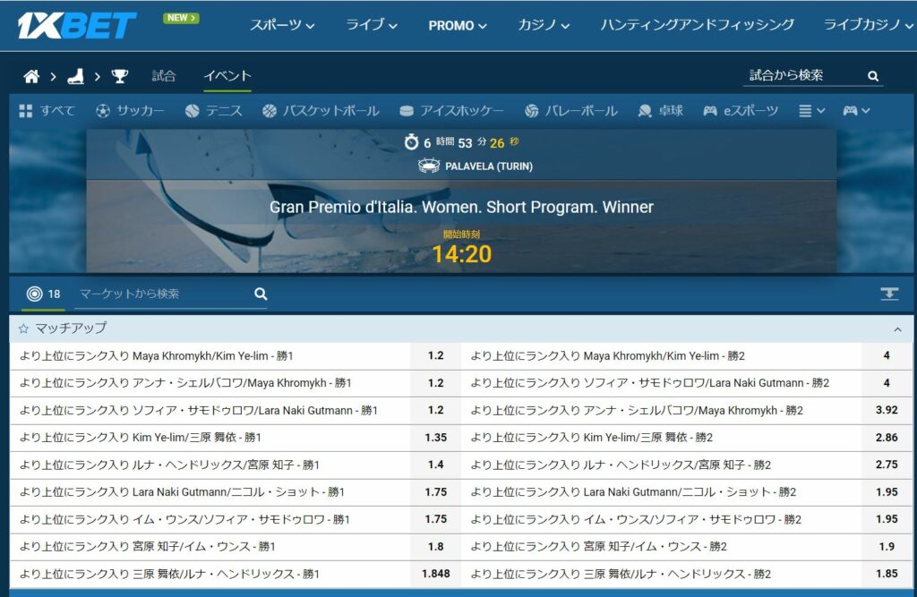 また、ショートプログラムが終わった後でも「勝者マッチアップ」にBETすることができるので、ショートプログラムの得点と演技の出来を確認してからフリースケーティングでどこまで点数が伸びるかを確認することができます。