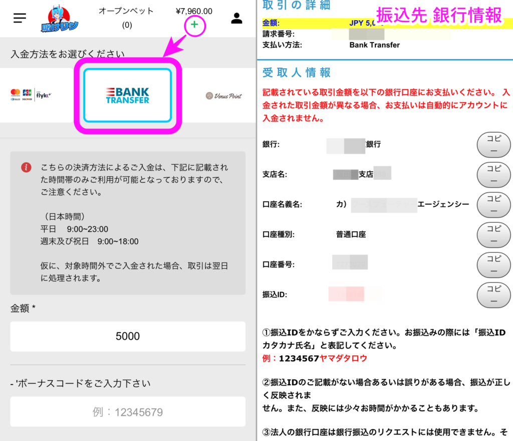 入金方法によって「最低入金額」が異なります。