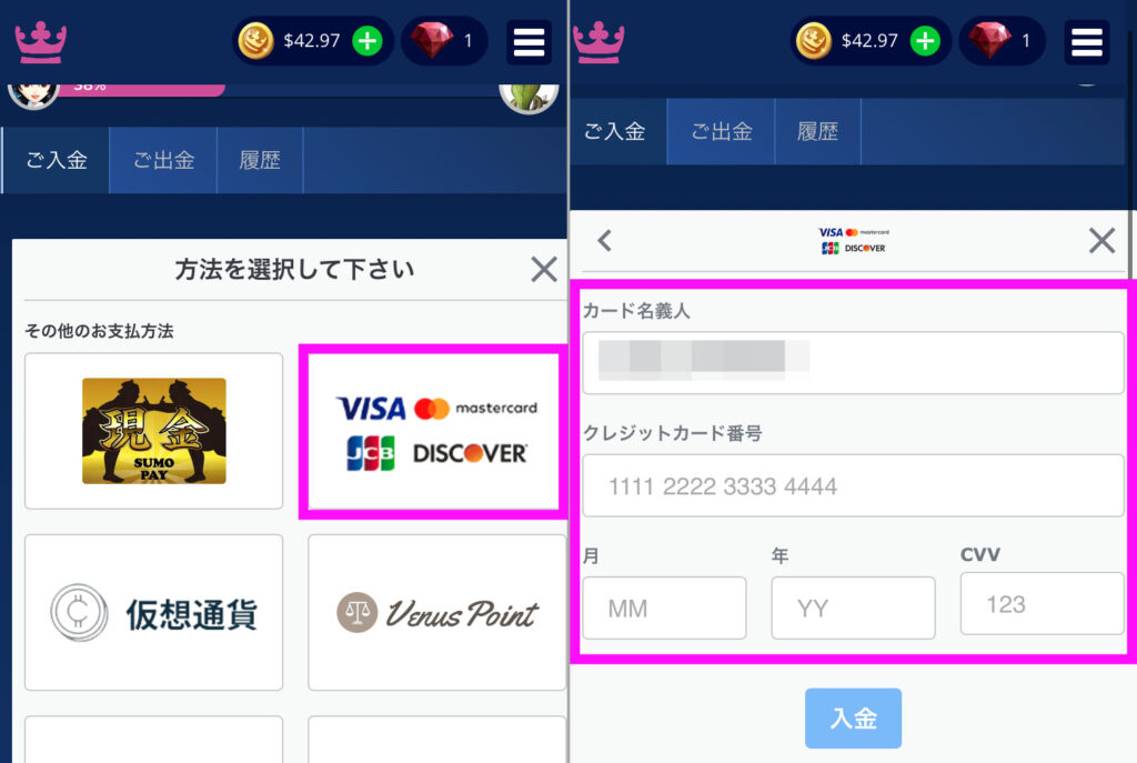クレジットカードの入金手順は、オンラインでネットショッピングをするのと同じでとても簡単です。