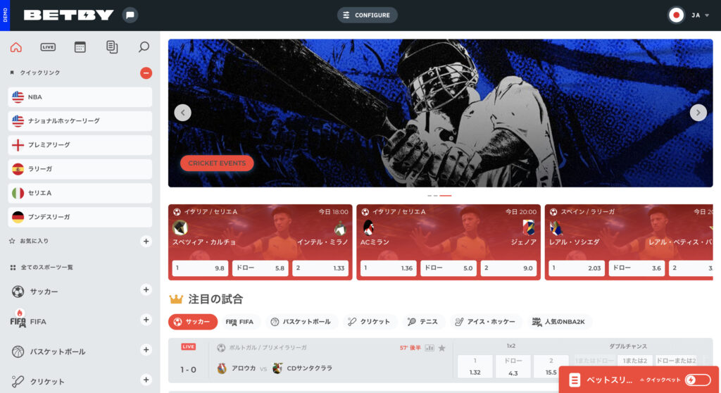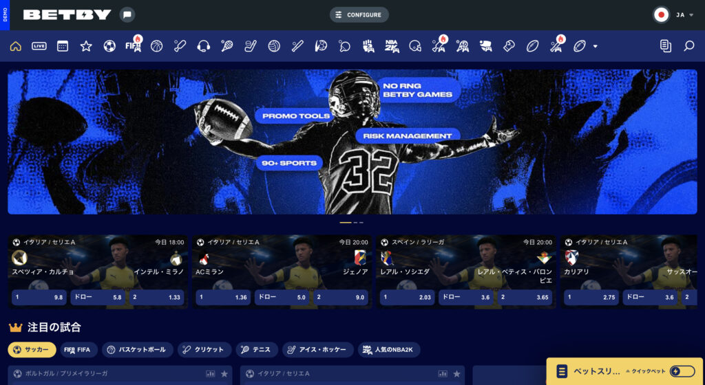 Betbyのウェブサイトではデモモードを利用でき、実際のサイトの仕上がりを確認したりもできるようになっています。