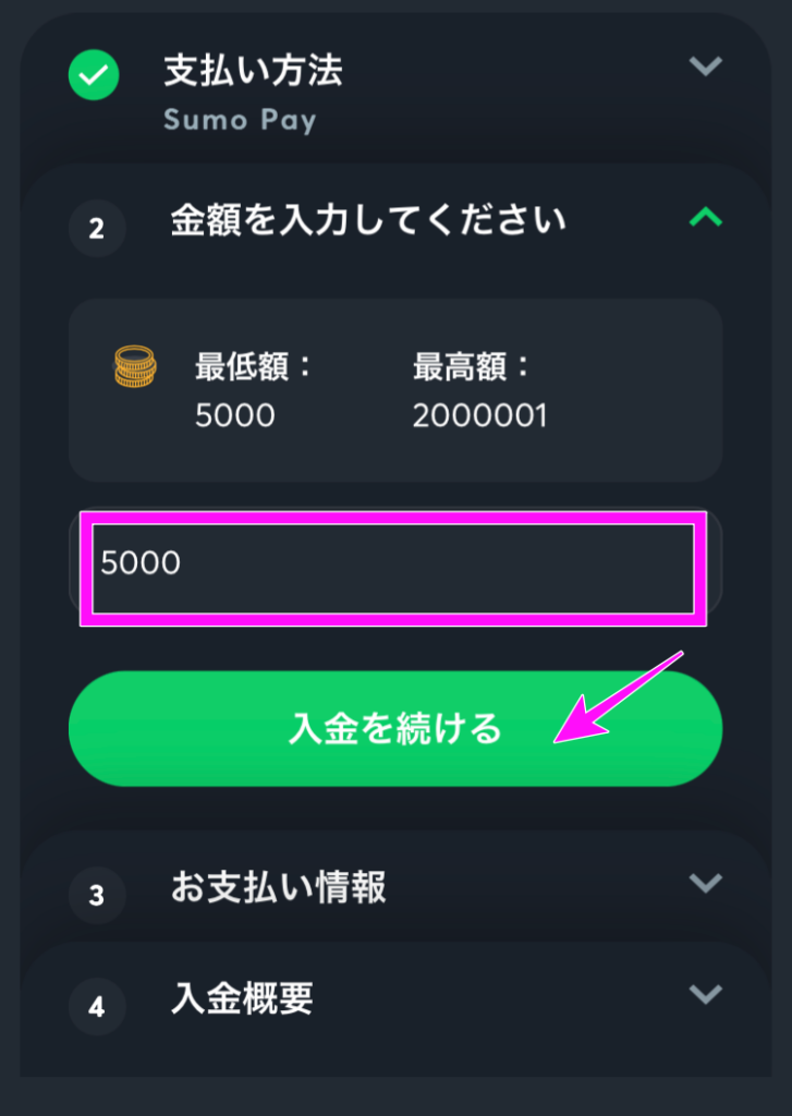 今回は最低入金額の5,000円を入力したら、入金を続ける を押します