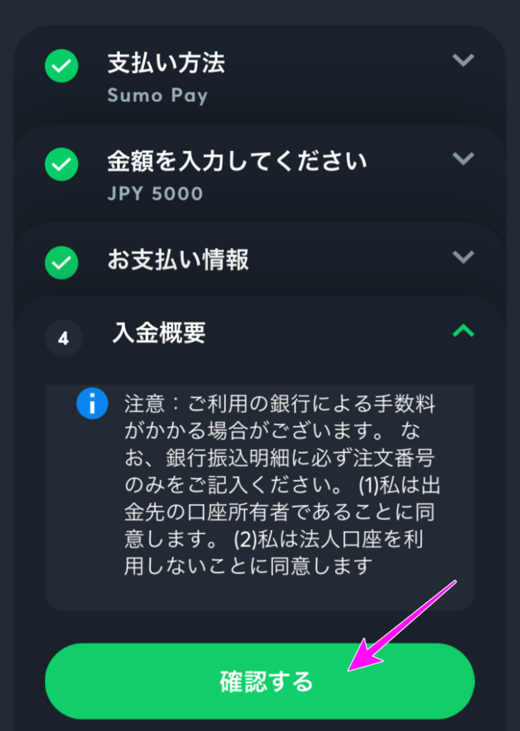 その他の銀行を選択した場合も、正しい手順で入金が完了していれば、通常30分〜1時間程度でアカウントに反映されます。