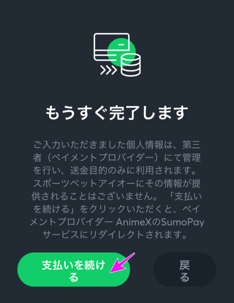 「ご入力いただきました個人情報は、第三者(ペイメントプロバイダー)にて管理され、送金目的のみに利用されます。スポーツベットアイオーにその情報が提供されることはありません。」