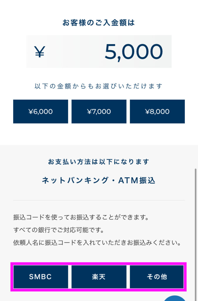 SMBC・楽天以外の銀行をお使いの場合は「その他」を選択します。すべての銀行で入金可能です。