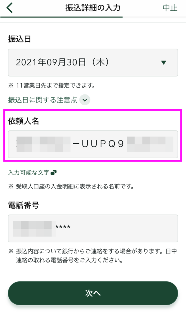 以下の画像のように銀行の入力画面で、依頼人名(自分の名前)を指定のコードに変えます。