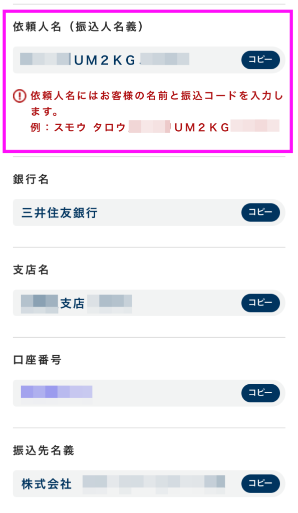 通常通りに振り込むと銀行の口座名義(山田太郎など)で振り込まれてしまうので、指定された注文コードを入力してください。