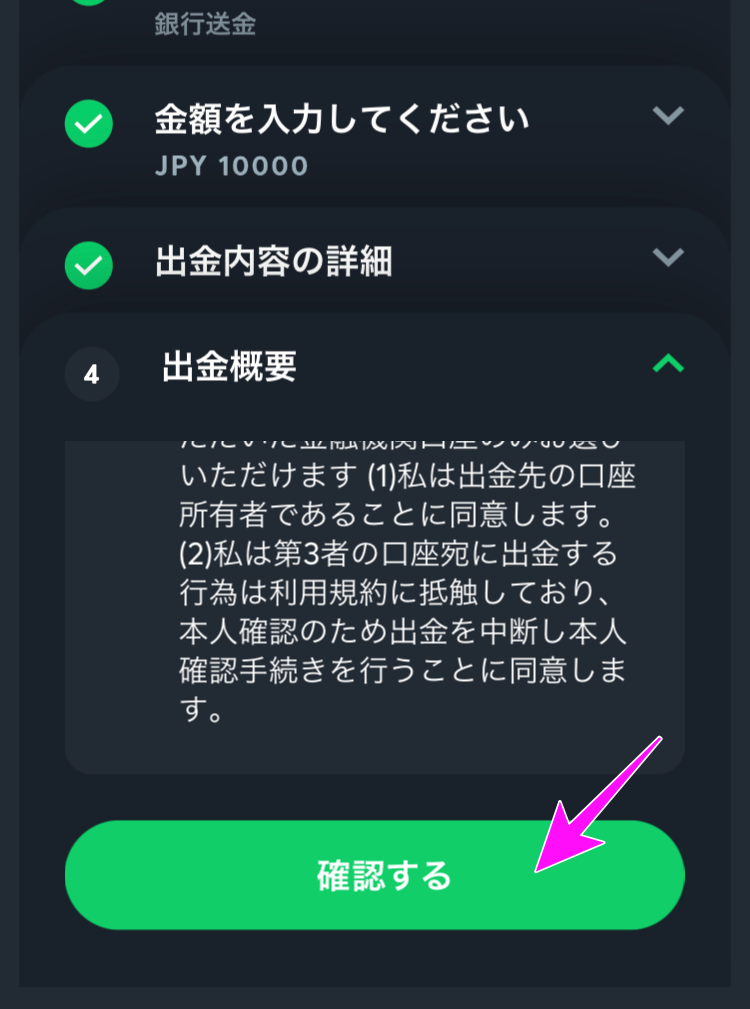 | 4. 出金概要 | 以下を確認します。 1. 自分自身の銀行口座への出金である 2. 第三者への出金は規約違反である |