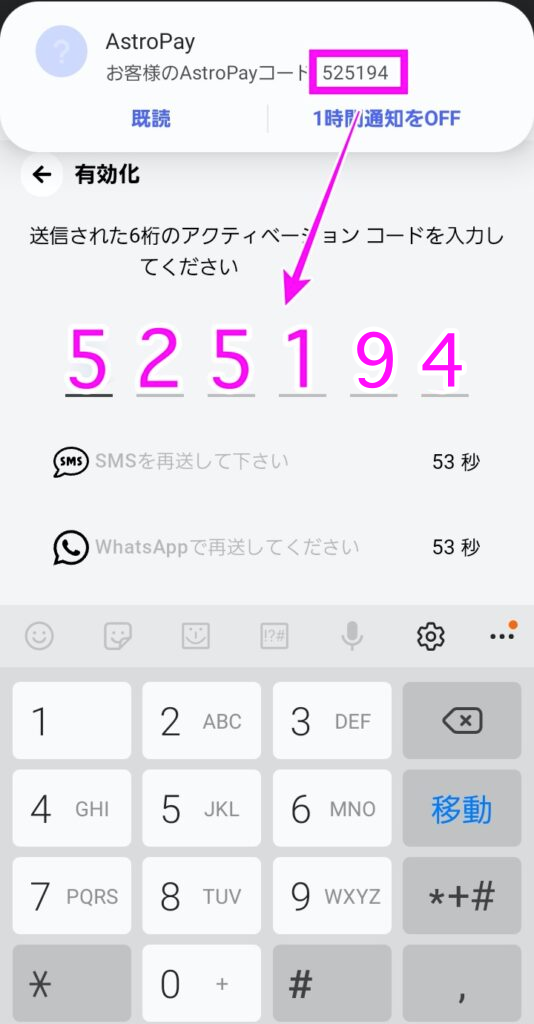 するとすぐにSMSが届くので、表示された数字を入力して進みます。
